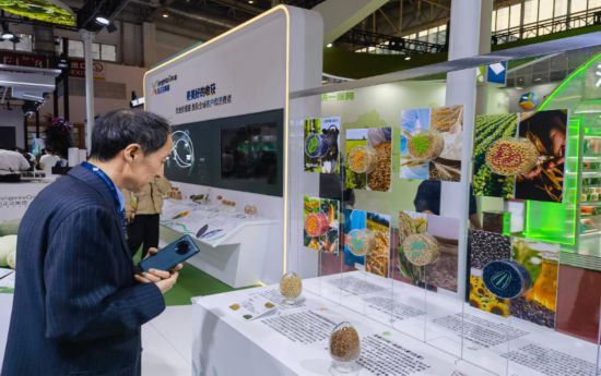 图为链博会上,参展观众在观察不同农作物的种子。新华社记者 于文静 摄